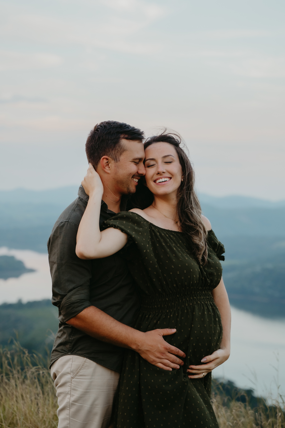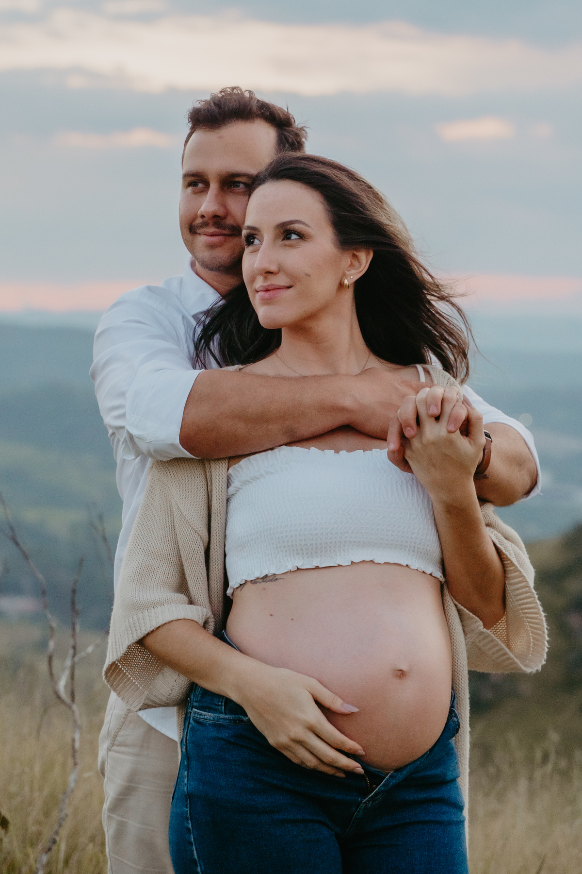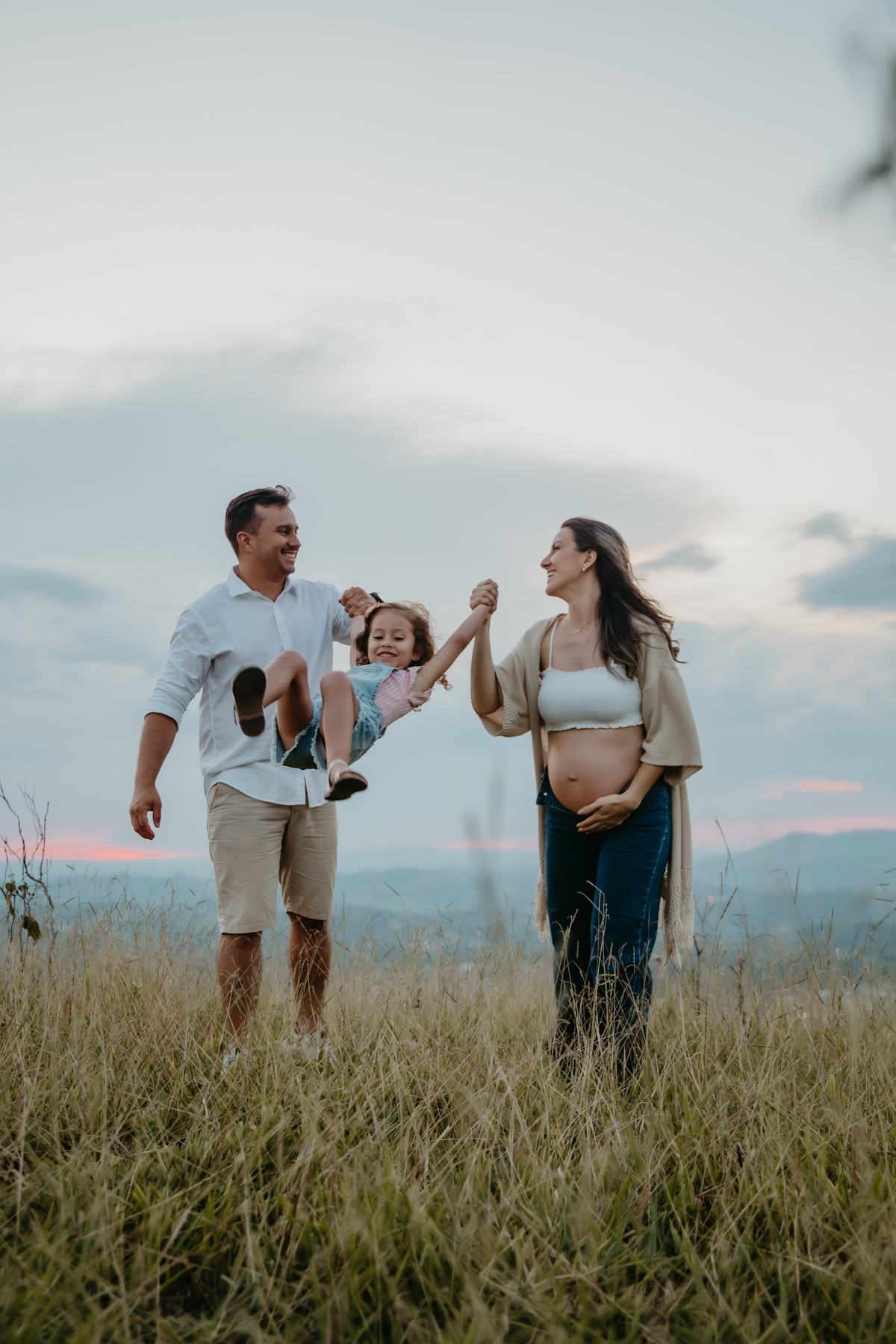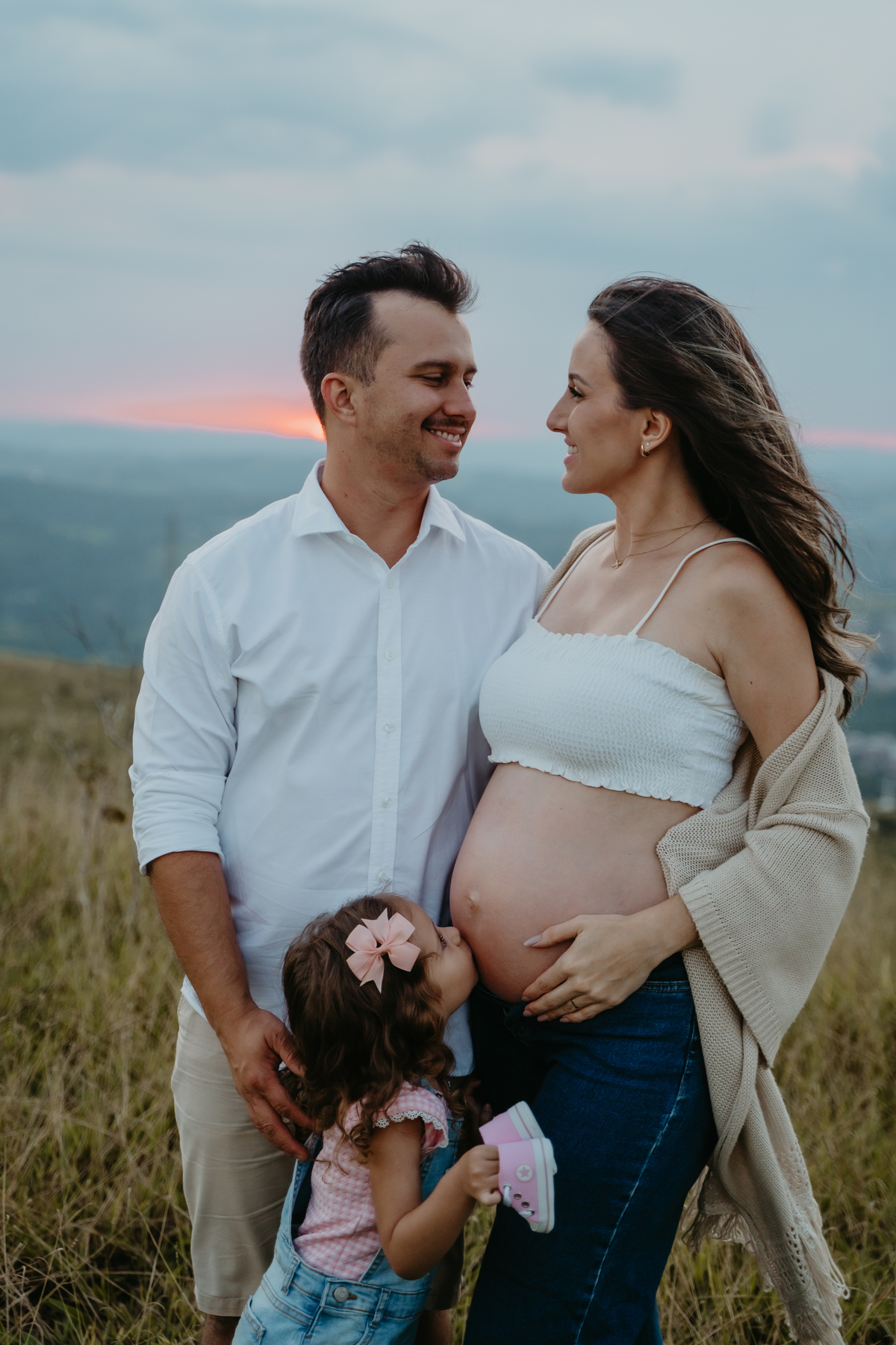 O ensaio gestante documental no campo, ao pôr do sol, é um abraço de luz e afeto.