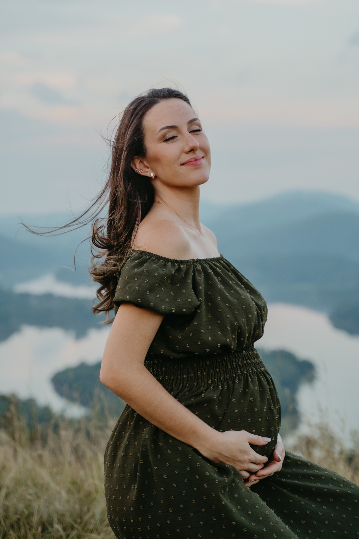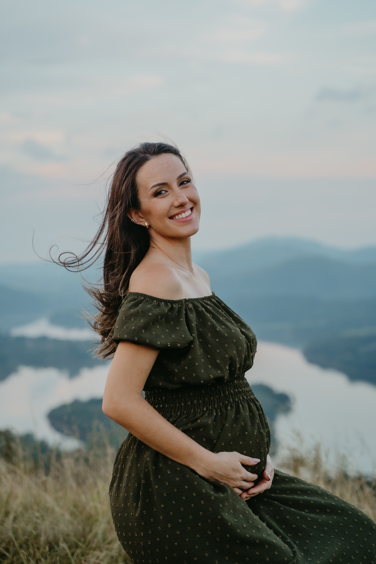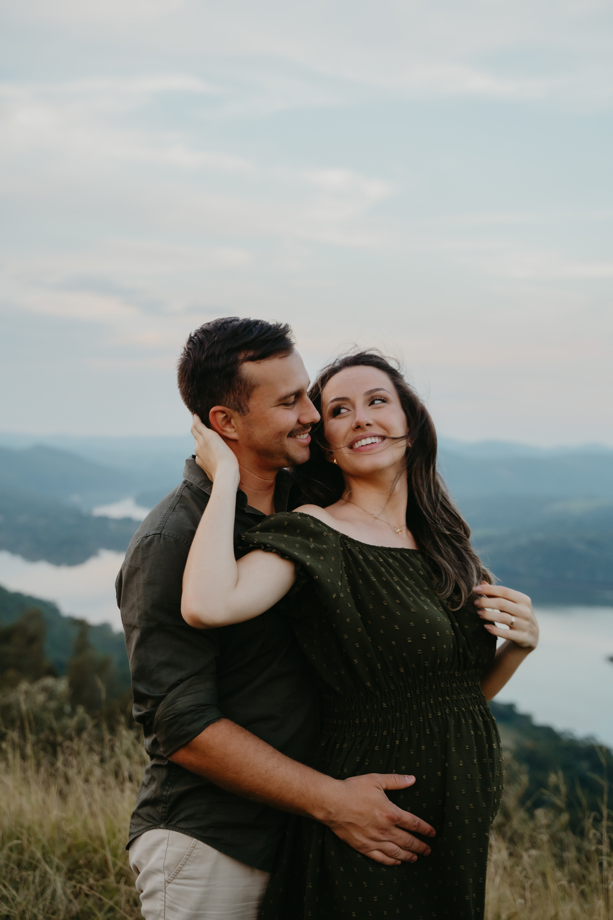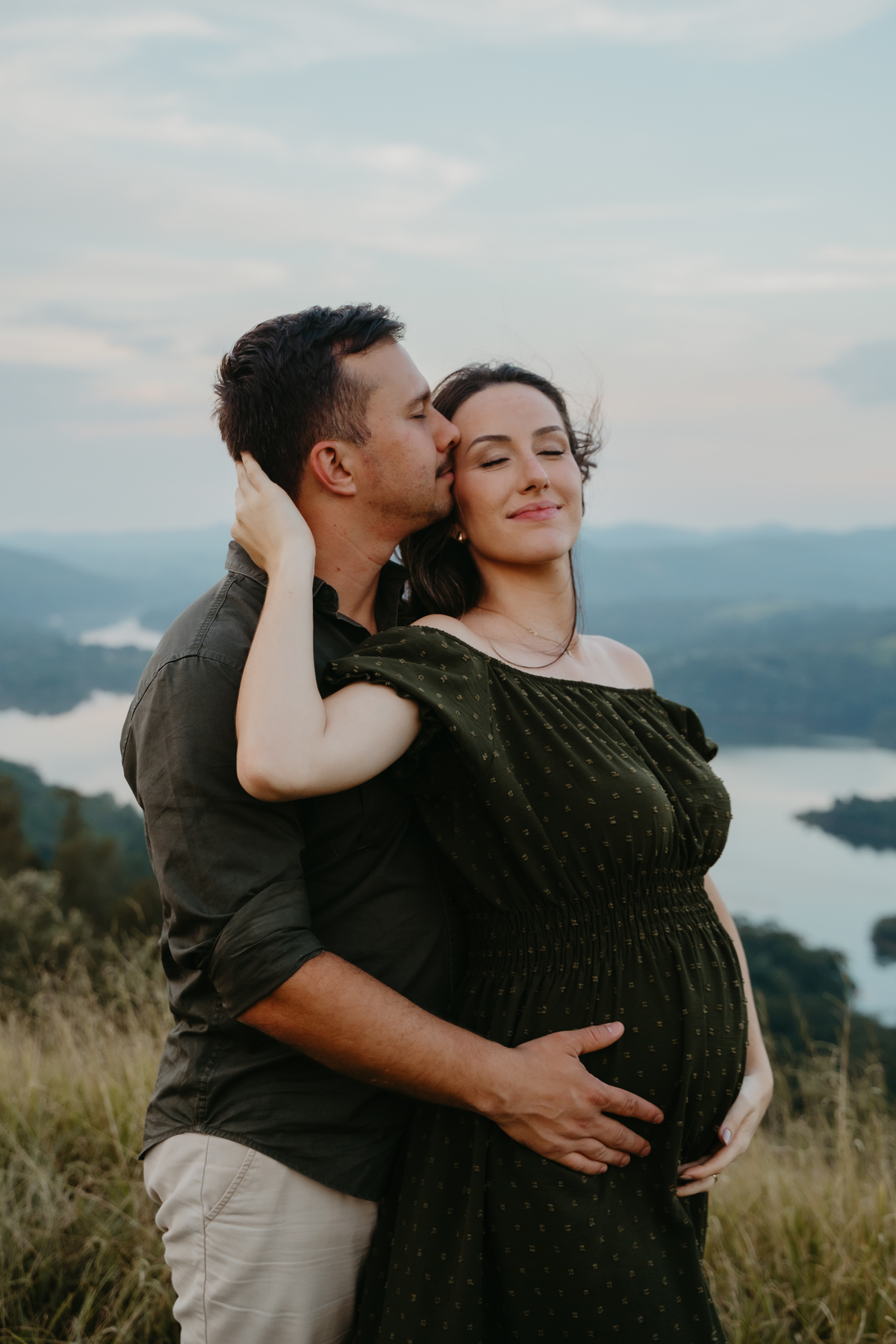 O ensaio gestante documental no campo, ao pôr do sol, é um abraço de luz e afeto.